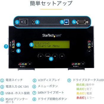 ステータス表示と消去確認:プッシュボタン付きLCDディスプレイでドライブを設定、ステータスを確認。RS232シリアルポートをESC/Pレシートプリンター(非同梱)に接続し、ドライブ種類と結果を印刷