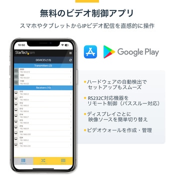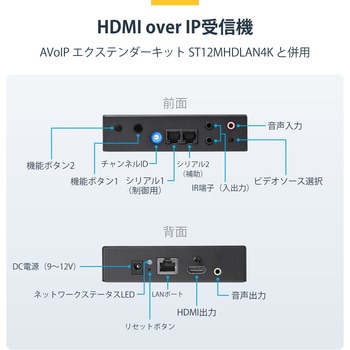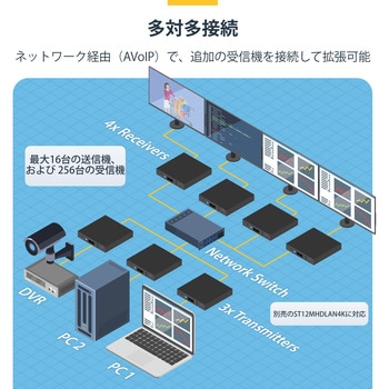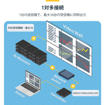 大型マルチスクリーン プレゼンテーション、ビデオウォール、ビデオ切り替え、ポイントツーポイント延長などに対応する柔軟なビデオ分配機能4K/30Hz解像度に対応、IPを介して驚きの画質を実現ビデオウォール制御が簡単にできる無料モバイルアプリ(iOS / Android)同梱の取り付け金具でプロ仕様の設置に対応ギガビットLANネットワークを使用して接続簡単な設定(2点間設定、1点-複数点の設定に対応)既存のネットワークインフラを活用してHDMIを拡張