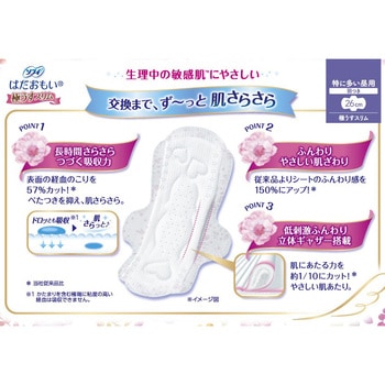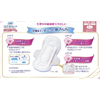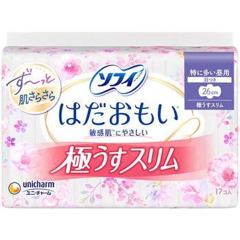 生理中の敏感肌TMにやさしい、はだおもい極うすスリム●「はだおもいシート」が、経血を表面に残さずしっかり吸収。だから、肌のサラサラ感が続き、肌にやさしい。●極上のやわらかな肌ざわり。●製品の裏側には、ナチュラルフラワーデザインを採用。●軽い日にぴったりの17.5cmなので、つけていないような軽やかなつけ心地で過ごせる。<以下注釈>医薬部外品