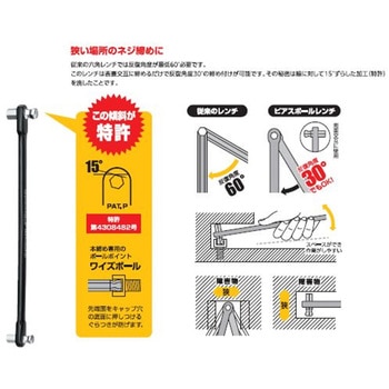 軸線に対して15°ずらした加工(特許)を施したことで、表裏交互に締めるだけで反復30°の締め付けが可能です。その秘密は軸線に対して15°ずらした加工(特許)を施したことです。2サイズ使える両口タイプです。打撃ショックにも耐えられるのでサビ付いたネジもはずせます。
