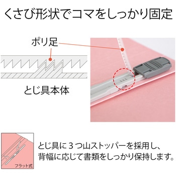 5.ズレることなくしっかりファイル。とじ具に3つ山ストッパーを採用し、背幅に応じて書類をしっかり保持します。