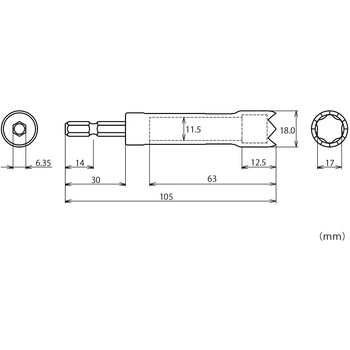 18Vインパクト対応。ソケット部の6角穴に6角軸を圧入することで、ねじれ・折れに強く、トルク伝達効率が高い。深穴式になっており、雄ネジの飛び出しが長い場合でも使用可能。先端の突起がPコンに付着したモルタルを破壊。サーフェイスにより、挿入しやすく、傷んだボルト・ナットにも威力を発揮。