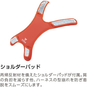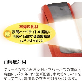 グレードの高い再帰反射材をフルハーネスの前面と背面にそれぞれ2ヶ所、ショルダーパッドに4ヵ所配置しました。