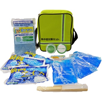 反射テープ付き保冷バッグ・応急処置用床敷シート×1枚・経口補水液ゼリー×2袋・5年保存水×2本・ポータブルソルト×1個・瞬間アイス×5袋・熱中対策タオル×1枚・圧縮タオル×1枚・扇子×1本・電子体温計×1本・熱中症予防ガイドブック×1冊