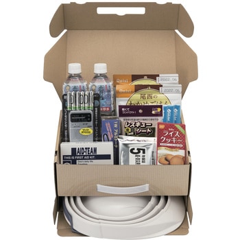 レスキューシート、簡易トイレ(1回分)×3、保存水(500ml)×2、ライスクッキー、五目ごはん(アルファ米)、わかめごはん(アルファ米)、ライト、救急セット、ウェットティッシュ、ポケットラジオ、単四電池(2P)×3+オサメット