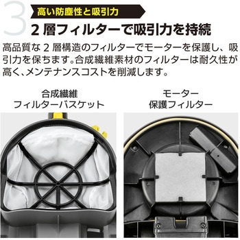 100V電源で使用できるケルヒャー業務用ドライクリーナーです。コンパクトなのに、3層フィルターでありながら、しっかりとした吸収力を持続します。