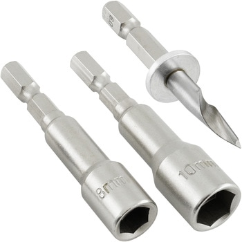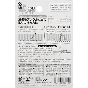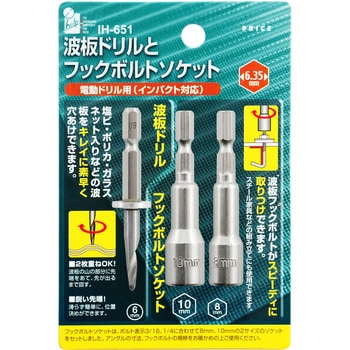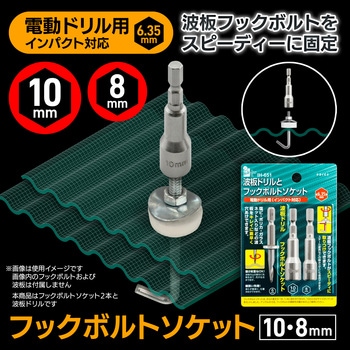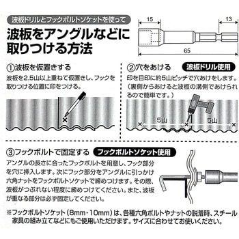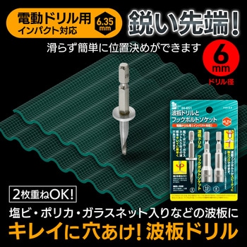 波板用穴あけドリル(6mm)と波板フックボルト用ソケット(8mm/10mm)をセットしていますので波板設置作業、張替え作業に最適です。ドリルは鋭い先端で滑らず、簡単に位置決めできます。波板を2枚重ねで穴あけ可能。フックボルトソケット(8mm、10mm)は各種六角ボルトやナットの脱着時、スチール家具の組み立てなどにもご使用頂けます。サイズに合わせてお使いください。