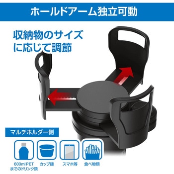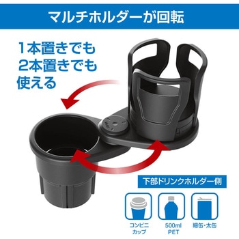 ホールドアームが可動することで、様々なものを置くことができるマルチホルダー。マルチホルダー側が回転することでドリンク1本分の純正ドリンクホルダーを2本分にできる。純正ドリンクホルダーに挿し込むだけの簡単取付。ドリンクを置いた際のカタカタ音を軽減する底面クッション付き。