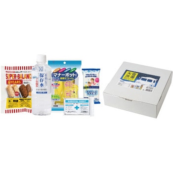 栄養機能食品【6年保存食品】×1袋(全粒粉2袋・ココア味2袋)、飲料水(500ml)【7年保存水】×1本、携帯用ミニトイレ×1個、防寒・保温シート×1枚、ウエットティッシュ(10枚入り)×1個