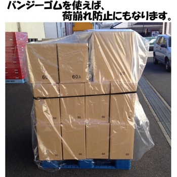 重労働であったパレット積み商品のフィルム巻き付け作業を簡略化。パレットに被せるだけでほこり、雨から商品を守ります。フィルムを巻くより時間短縮に。バンジーゴムと併用すれば、荷崩れ防止にもなります。