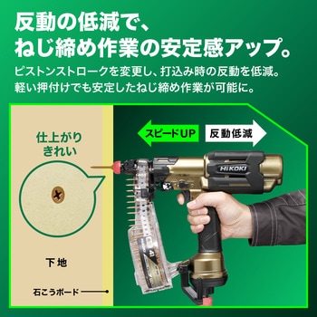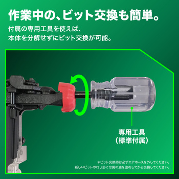 ねじなのにスパッ!と入る。反動が少なく、極上のフィーリング。業界最速のねじ締め速度!(従来機比1.7倍)。お手入れ・交換ラクラク(ツールレスでマフラの交換が可能でオイル飛散低減!ビットは専用工具を差して回すだけで交換可能)。パワー2段階切替機能搭載。ねじ残量が見やすい透明マガジン