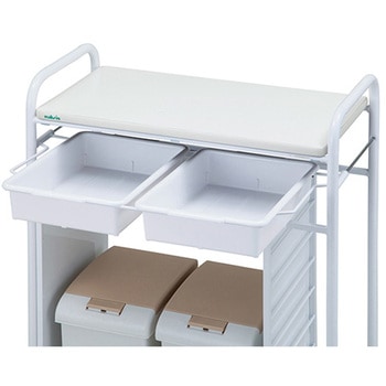 ダストボックスはプッシュ式で、パッキンが付いており、臭いが漏れにくい仕様です。エプロンや小物類を収めるのに便利なトレー付きで、手前に引き出すことができます。手袋やティッシュケースが入る便利なグローブホルダーが2個付属しています。片面でオムツ交換作業が完結できます。