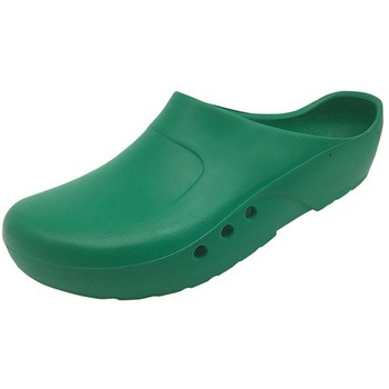 つま先をしっかり保護、及び高くなったヒールプロテクターで踵を保護します。手術など長時間の立ち仕事に適しています。底は滑り止めが付いています。横には通気穴があります。