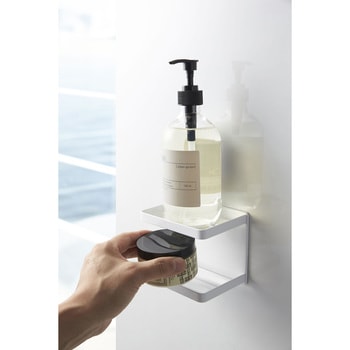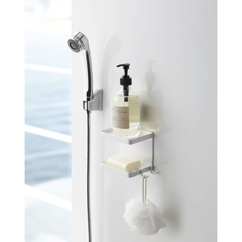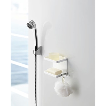 マグネットが付く浴室壁面に簡単取り付けのソープトレー。ディスペンサーと石鹸を同時に収納できる省スペースタイプ。取り付け自在なフック2個付き。