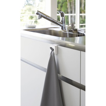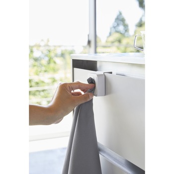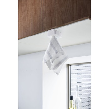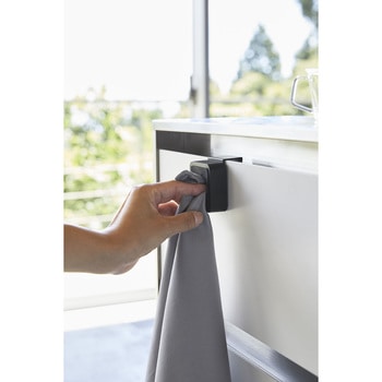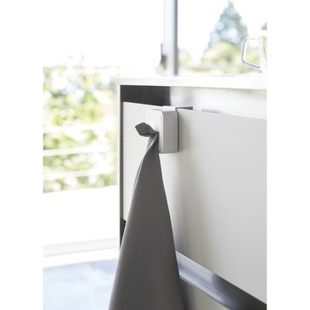 シンク扉に簡単取り付け。タオルや布巾を指で差し込むだけのタオルホルダー。戸棚下にも取り付け可能。