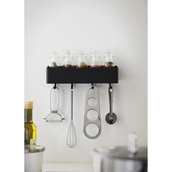 フックの取り付け位置が壁側と外側にあり、外側にすることで計量カップなどの厚みがあるものを吊り下げる事が出来ます。この点が普通のフックと比べて予想外に良い点でした。残念なところは箱の底にはフックを取り付ける隙間がたくさん空いているので小さいものや細いものは落下します。