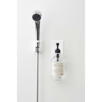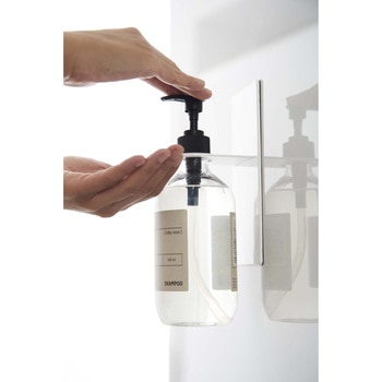 ディスペンサーをマグネットで好きな位置に設置できるホルダー。 宙に浮かせるからボトルの底がぬめらず衛生的。そのままポンプを押して液体を出すことができます。