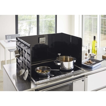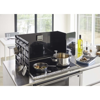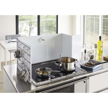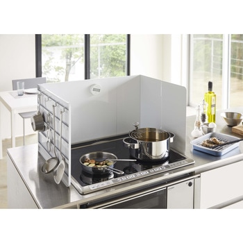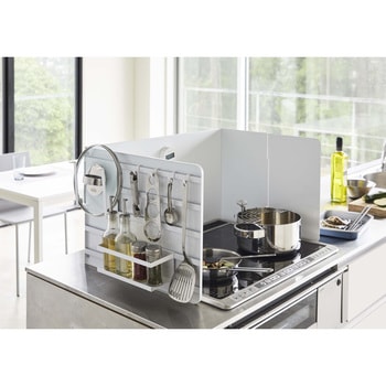 レンジのサイズに合わせて伸縮できる伸縮レンジガード。調理中の油はね・拭きこぼれをガードしてくれます。凹凸のないフラットな設計だから油汚れもサッとひと拭きできてお手入れも簡単です。収納付きパネルには別売りの収納ツールを自由に取り付けてアレンジ自在!