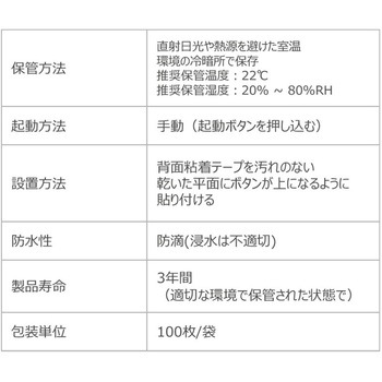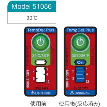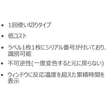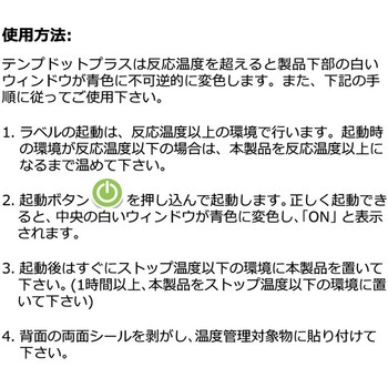 1回使い切りタイプ。低コスト。ラベル1枚1枚にシリアル番号が付いており、識別可能。不可逆性(一度変色すると元に戻らない)。ウィンドウに反応温度を超えた累積時間を表示。使用方法:テンプドットプラスは反応温度を超えると製品下部の白いウィンドウが青色に変色します。Model 51056の起動は、30℃/86°F以上の環境で行います。起動ボタンを押して、起動します。起動時の環境が30℃/86°F以下の場合は、本製品を30℃/86°F以上になるまで温めてください。正常に起動すると、中央の白いウィンドウが青色に変色し、「ON」 と表示されます。起動ボタンは温度逸脱時に正常に染色されるように起動ボタンが潰れるまで押してください。不必要な染色を防ぐ為、起動後はすぐにストップ温度以下の環境に本製品を置いてください。少なくとも2時間は本製品をストップ温度以下の環境に置いてください。背面の両面シールを剥がし、温度管理対象物に貼り付けてください。