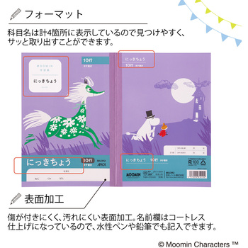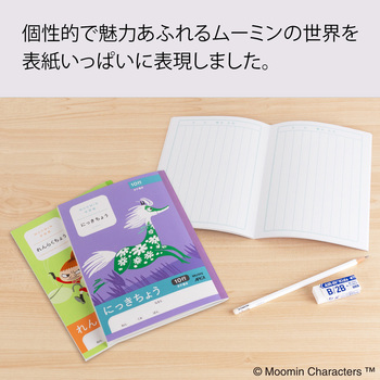 家族や仲間を想う心を学習帳を通して子どもたちに伝えられるように、個性豊かなムーミン谷の物語を表現したデザインです。