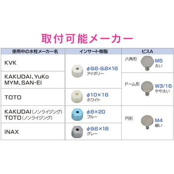 各メーカーに対応したアダプターとビスがついているので、ほとんどの水栓に取付けることができます。