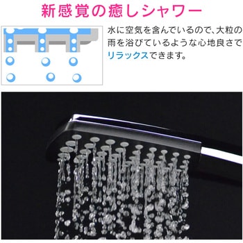水の中に空気を混ぜることで、シャワーの勢いを損なうことなく水を節約できます。また、大粒の雨を浴びているような浴び心地でリフレッシュできます。取付ネジはG1/2です。KVK・MYMなど、取付ネジG1/2以外へ取付の場合はアダプターを別途お買い求めください。
