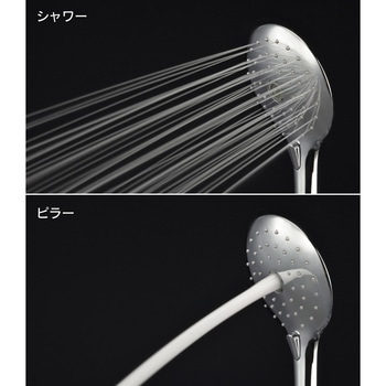 柱状の水流が体に沿って流れ、温かい湯に柔らかく包まれるような浴び心地です。柱状に流れるため、外気に触れる表面積が小さくなることで放熱を抑え、高い温まり効果を得ることができます。手元のボタンでシャワーとピラーの切替が簡単にできます。軟質噴板採用で目詰まりなどのお手入れ楽々。噴板の突起を指でなぞるだけ。取付ネジはG1/2です。KVK・MYMなど、取付ネジG1/2以外へ取付の場合はアダプターを別途お買い求めください。