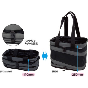 折りたたみ式でコンパクトに!スプリング式でパッと開いてしっかり自立!現場でのごみの収集に資材や道具の運搬・収納に折りたたみ時は、バックルでカチッと固定