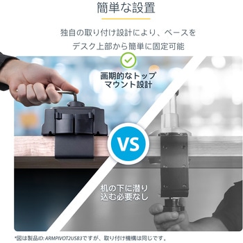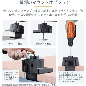 簡単設置:付属のツールでCクランプを上から締めて固定、またはグロメットマウントでデスクトップに設置。着脱式のVESAプレートでモニタの取り付けが簡単。多関節テンション調整用のツール付属