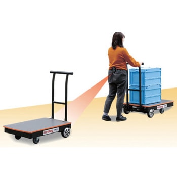 追従モードとラジオコントロールモードのみのシンプル機能です。折り畳み可能なハンドルで通常の手押し台車として使用可能です。。ハンドルが折り畳み可能で、コンパクトに収納できます。車体の前後に装備したセイフティーレーザーセンサーで、人や障害物を検知します。バッテリーは簡単に着脱可能です。リモコンは追従モードの発信部と、ラジオコントロールモードのリモコン、二つの機能を併せ持ちます。USBケーブルで充電します。