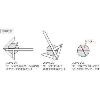円形の外周にあて、センターラインをけがくことで中心位置を決定