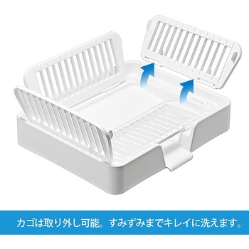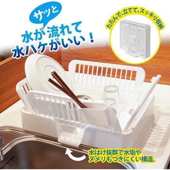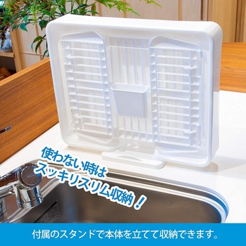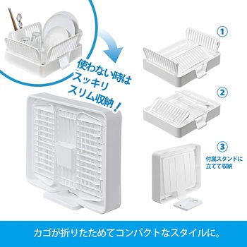 たたんで、立てて、スッキリ収納できる食器用水切りカゴ。カゴが折りたためてすっきりコンパクトなスタイルに。付属のスタンドで本体を立てて収納できます。箸立ては邪魔にならないスリムなデザイン。水は流出口からシンクに。水はけ抜群で水垢やヌメリもつきにくい構造。カゴは取り外し可能。すみずみまでキレイに洗えます。