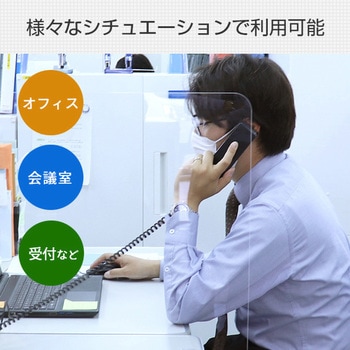 飛沫感染対策のアクリルパーテーション(仕切り)。オフィス、会議室、受付等様々なシチュエーションで利用可能。小さいスペース、デスクなどに置きやすいサイズ。4mm厚の丈夫なアクリル板。透明度が高く違和感無く使用が可能。パネル下の隙間から書類の受け渡しもラクラク。パネル下の隙間はパソコンのコード類を通す空間としても利用可能。組み立て式で使用しない際はコンパクトに収納できる。