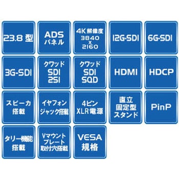 付属品ACアダプター/TALLY用コネクタ/取扱説明書規格4K/UHD消費電力(W)最大62出力12G-SDI×2/3G-SDI×2/イヤホンジャック(3.5mmステレオミニピン)電源XLR4ピンDC12~24V(推奨15V)表面処理アンチグレア寸法(幅W×奥行D×高さH)(mm)579×68×376.4入力12G-SDI×2/3G-SDI×2/HDMI2.0×1(HDCP1.4)/HDMI1.4×3(HDCP1.4)コントラスト比1000:1解像度3840×2160保証期間1年入力端子12G-SDI×2 / 3G-SDI×2 / HDMI 2.0×1(HDCP 1.4) / HDMI 1.4×3(HDCP 1.4)VESAマウント(mm)100×100/200×200スピーカー2W×2(LR)色(本体)ブラックアスペクト比16:9モニターサイズ23.8型パネル駆動方式ADS内容量1台