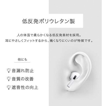 エアーポッズ プロ専用のポリウレタン製低反発イヤーピースです。体温で柔らかくなる特性のある低反発素材を採用しており、耳への負担を軽減します。耳の形状に合わせて変形するため、遮音性が高く、音漏れを防止すると同時にイヤホンの音質を十分に感じられるようになります。