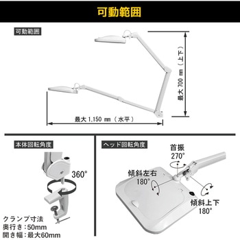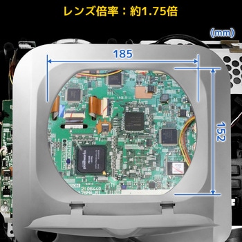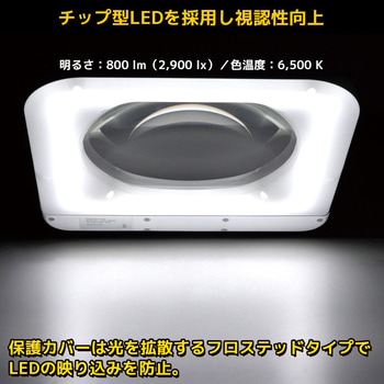 大口径レンズと照明で検査などに幅広く対応。透明度が高く、視野の歪みが少ない、大口径ホワイトレンズを採用し、明るい広い視野を確保。照明付きで暗い場所での作業が可能。ワンアクションでアームが作動し、位置や角度を自在に調整可能。保護カバーに光を拡散するフロステッドタイプを採用し、LEDの映り込みを防止。従来の砲弾型LEDよりも明るい、チップ型LEDを採用し、視認性が向上。