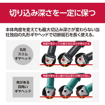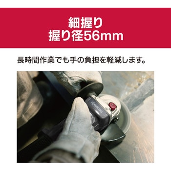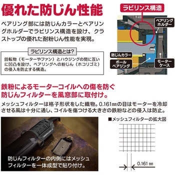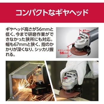 ブレーキ付狭いところも入り込めるクラスで最も低いスリムギヤヘッド直径56mmの細握りグリップ鉄粉の侵入を防ぐメッシュフィルタ付の防塵フィルタ軽くしっかり握れる全長26cmのコンパクトボディ優れた防じん性能(ラビリンス構造)