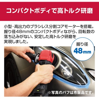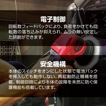 業界初 小径75mmの京セラ独自のギヤアクション機構バフ目を出しにくいパッド軌跡ブラシレス分割コアモーター採用による小型軽量化の実現作業に応じた回転数を高速・中速・低速の3段階に設定できる変速機能付き回転の落ち込みがなく安定した磨きができる電池残量表示付き