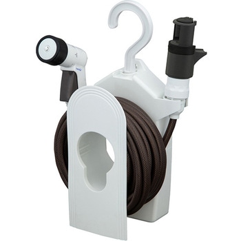 ベランダや狭い場所での散水に最適なコンパクトタイプのホースリールです。ラティスなどに引っ掛ける回転フック付です。ホワイト/ブラウンでベランダやお庭に馴染む色合いです。通水・止水の切り替えが手元のレバーでワンクリック操作で簡単です。スリーブを回すと4つの水形(キリ・ストレート・ジョロ・シャワー)と切り替えができます。ノズルとコネクターを簡単に着脱できます。安心の2年間保証付きです。