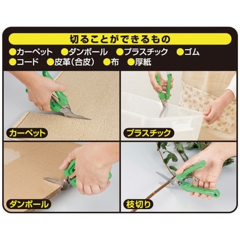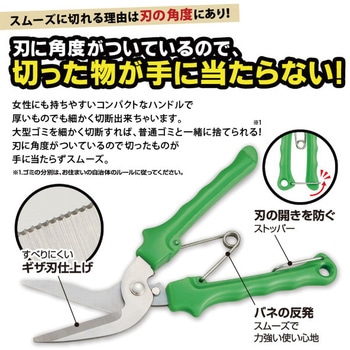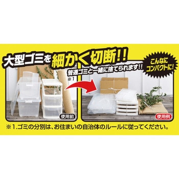 大型ゴミを細かく切断し、普通ゴミと一緒に捨てられます!(※ゴミの分別は、お住まいの自治体のルールに従ってください。)刃に角度がついているので切ったものが手に当たらずスムーズに切れる。コンパクトで手の小さい女性にも使いやすい!カーペット、ダンボール、プラスチック、枝切りなどに。