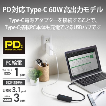 USB Type-Cポート搭載パソコンでUSB3.1 Gen1対応デバイスが使える。USB-Aポートを3つ搭載し、パソコンに給電もできるUSB Power Deliveryに対応したUSBハブ。