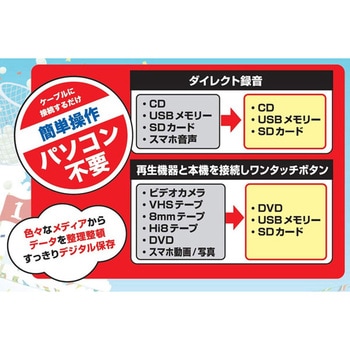 パソコン不要でCDからCDへ2.5倍速ダビング。メディアレコーダー。撮りだめたVHSテープや8mmテープをかんたんにダビングできる。外部プレーヤーからDVD/SD/USBのメディアに録画可能。TVチューナー内蔵機器との接続でTV番組録画も。本機をTVモニターと接続で大画面で観ることも可能。