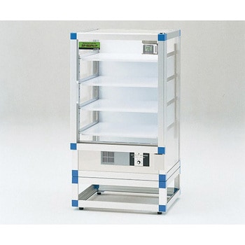 デシケーター内のデッドスペースを無くし、庫内を広く有効利用できます。新型扉開閉機構を採用し、扉開閉時のデッドスペースを無くす事により、壁面に隙間なく設置できます。新型除湿ユニットには駆動部が無く音や振動の発生源もありませんので、耐久性に優れています。デシケーター内部の水分は直接気体状態で外部へ放出しますので、水滴(ドレン)が出ません。ゴム足付き仕様です。湿度調節は前面パネルでコントロール(アナログ設定)します。軽量アルミフレームと樹脂製クリアパネルのスタンダードシリーズ。新型固体高分子電解質膜(ロサール)を前面パネルに装備し庫内空気中の水分を直接電気分解し連続的に除去しますので、安定した除湿を行う事ができます。