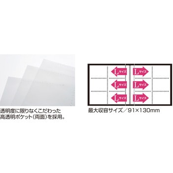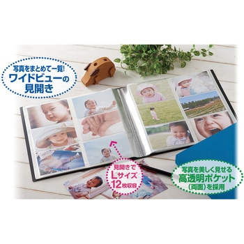 閲覧性を高めたワイドビューの見開き大容量480枚収容のフォトアルバムLサイズの写真を480枚収容する大容量タイプ。冊ケース付き。両面にあるポケットは、写真が映える高透明のOPP素材を採用。写真の収容が簡単なサイドインポケット。保管・分類整理に便利なタイトルシール付き。