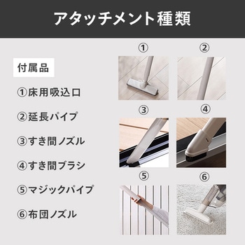 仕様アフターパーツ:HC-AF145 ニッケル水素電池パック付属品充電台、ACアダプター(HC-CH98)、床用吸込口、延長パイプ、すき間ノズル、すき間ブラシ、マジックパイプ、布団ノズル寸法(mm)約345×105×180、収納時:約220×300×360、【マジックパイプ寸法】ホース収納時:全長約350、ホース使用時:約903質量(kg)約1.0(製品のみ)、約1.9(付属品含)消費電力(W)充電中:6、満充電時:1(本体を充電台に載せない時0.1)スイッチスライド式 ON/OFF電源充電式集塵容量(L)約0.45電源コード(m)約1.8連続使用時間(分)約10使用電池専用ニッケル水素電池パック(HC-AF145)/7.2V/2000mAh集塵方式サイクロン式充電入力電源(V)AC100(50/60Hz)/0.5A MAX充電時間(時間)6(充電タイマー/充電完了時LED消灯)充電出力電源(V)DC12/500mA内容量1台