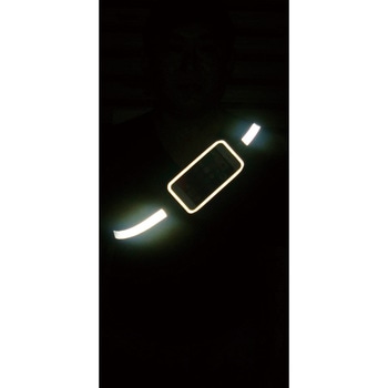 両手がフリーになる肩掛けタイプのスマートフォン用ショルダーケースで、ウエストポーチとしても使用できます。ベルト部は、バックルが付いており調整可能です。伸縮性のあるゴム部には57m先からでも反射するJPマーク認定の視認性の高い反射機能が付いており、夜間の安全対策品としても活躍します。指紋認証以外のスクリーンタッチは、ケース(透明部)の上からでも操作可能です。ポーチ内部は2層構造でスマートフォンと一緒に小物やタオルなどを入れるのに便利です。イヤホン用の穴も付いております。