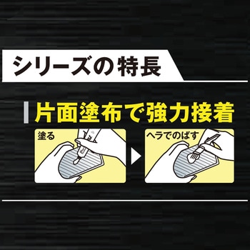 広範囲の材料の接着。屋内外、凹凸面、水回りでの接着と補修。膨張係数の異なる材料同士の接着。合成ゴム・軟質塩化ビニル・硬質プラスチック・木材・皮革・布・フェルト・発泡スチロール・タイル・陶磁器・コンクリート・石・ガラス・金属