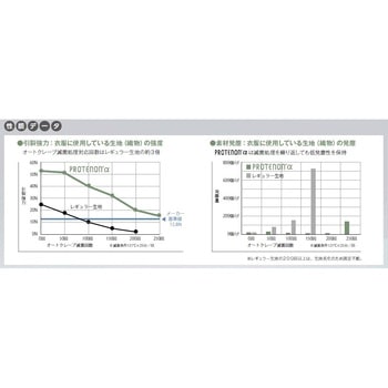 プロテノンαを使用したウェアはオートクレーブ滅菌に対してレギュラーポリエステル繊維に比べ優れた耐久性を発揮、長時間安心してご使用いただけます。オートクレーブ滅菌処理に優れた耐久性をもち、医薬品製造環境に求められる高清浄度を実現した防塵服です。