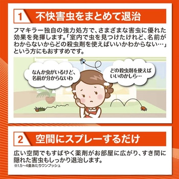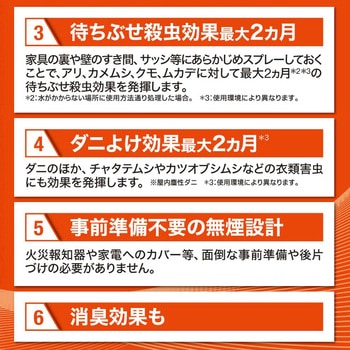 50種類以上のイヤな虫に効く。空間にスプレーするだけで隙間に隠れた害虫も逃さず退治。ダニよけ効果最大2週間。面倒な事前準備や後片付けが不要。