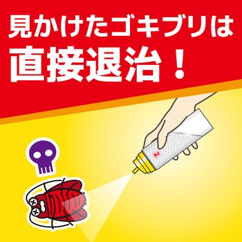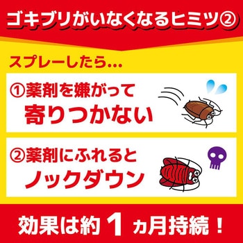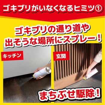 【特長】いつのまにか”ゴキブリがいなくなる!”1.ゴキブリの通り道や出そうな場所にスプレーするだけ。ゴキブリをまちぶせ駆除し、寄り付かなくなります。2.効き目が約1ヵ月持続。3.ゴキブリに直接噴霧しても高い殺虫効果があります。4.LPGや石油は不使用で低刺激。5.ゴキブリが潜むすき間に使用しやすいのノズルを採用。6.缶を逆さにして使用。ゴキブリが通る床面に噴射しやすい設計。